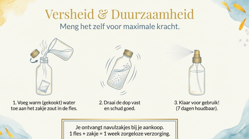 Het grote voordeel? Het heeft een laag natriumgehalte, waardoor het niet prikt of brandt als je het op je wond sprayt. Bij aankoop krijg je bovendien 5 navulzakjes, zodat je altijd een verse oplossing bij de hand hebt.
