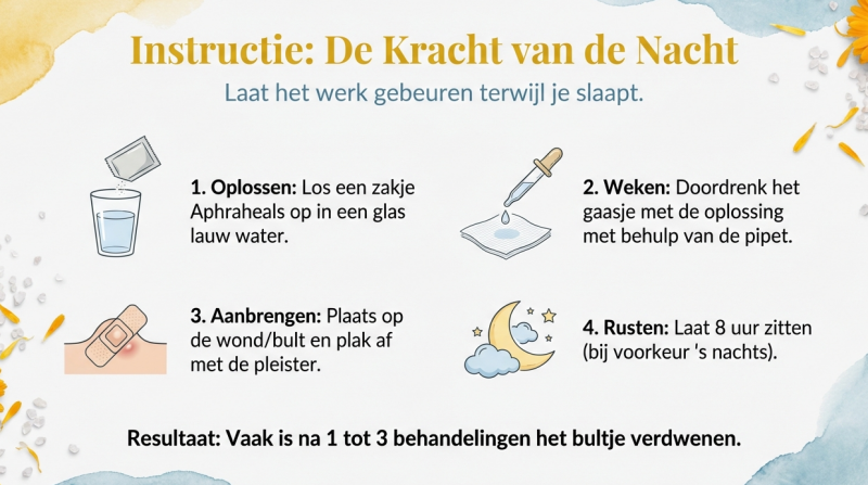 • De gouden tip: Maak het gaasje nat met de bijgeleverde pipet en laat de pleister 's nachts (ongeveer 8 uur) zitten terwijl je slaapt. Vaak zie je na 1 tot 3 nachten al resultaat.
